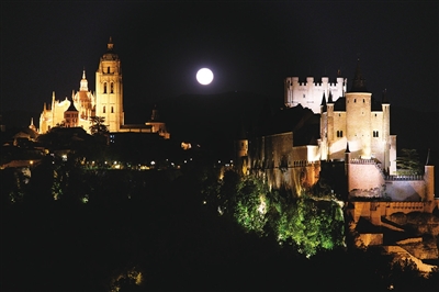 这是8月1日晚在西班牙塞哥维亚拍摄的“超级月亮”和塞哥维亚主教座堂(左)及塞哥维亚城堡。