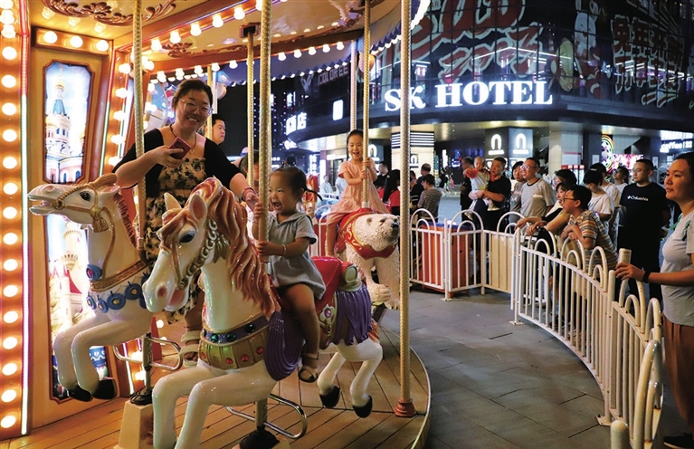 暑假期间,我市各游园经济活力四射,市民消费热情高涨。8月8日晚,省城红沟东巷一广场游乐园内让小朋友们收获了满满的欢乐。张昊宇 摄