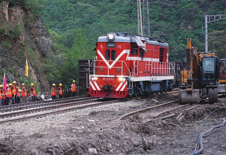 8月8日18时30分许,轧道机车缓缓通过丰沙铁路珠窝站,标志着丰沙铁路经过71小时抢通恢复通行。与此同时,首列货物列车于8月8日14时47分从沙城出发,开往三家店方向。丰沙铁路是连接北京市丰台区和河北省张家口市怀来县沙城镇的铁路线。新华社记者 张晨霖 摄