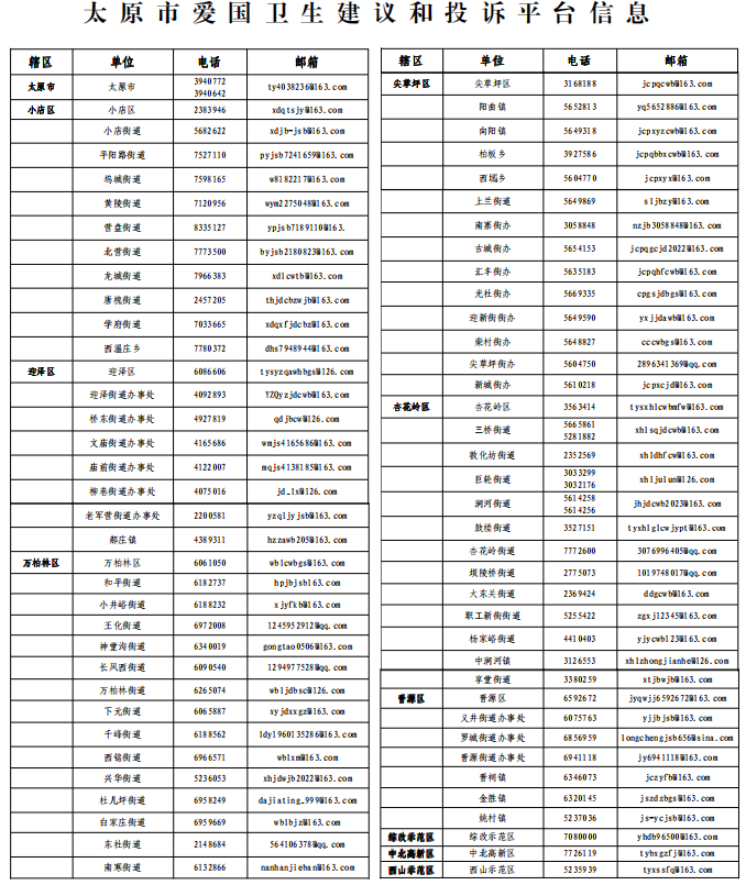 为深入推动我市爱国卫生运动及国家卫生城市创建工作顺利开展,充分发挥群众监督作用,畅通群众投诉建议渠道,凝聚社会力量和群众共识,提高广大人民群众对爱国卫生工作的认知度、参与度和满意度,协调、督促相关部门解决广大人民群众关注的社会卫生问题,积极采纳群众的合理意见和建议,切实解决好群众关心的实际问题,遵循依法、高效、便民的原则,建立太原市建成区内爱国卫生建议和投诉平台,现将相关事宜公示如下: