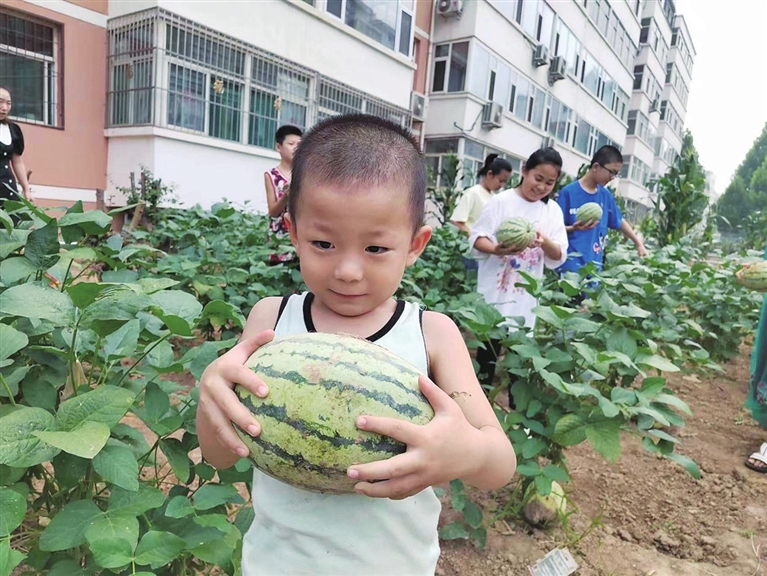 “去摘西瓜喽!”孩子们一同走到郑村社区劳动实践基地,看着满地的西瓜,欢呼雀跃。首先,基地的志愿者老师引导孩子们通过观察,了解西瓜的生长方式。然后,小朋友们了解到西瓜从种植到结瓜再到成熟的过程,学到了栽培西瓜的一些知识。