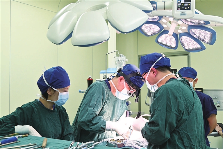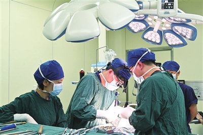 北大医院太原医院挂牌一年来,北大医院充分发挥“国家队”优势,长期派驻5位专家、短期派驻27个科室共117位专家,到北大医院太原医院出诊、手术、培训、带教、查房,开展新技术30多项。图为北大医院骨科专家孙浩林在北大医院太原医院为腰椎间盘突出症患者实施腰2/3微创MIDLF术+显微镜下硬膜囊切开探查髓核摘除术。