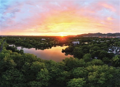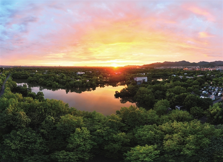 杭州市西溪湿地日出景观(7月31日摄,无人机照片)。在“绿水青山就是金山银山”理念指引下,浙江生态建设久久为功,绿色成为发展最动人的色彩。山更绿、水更清、天更蓝、地更净,浙江生态持续向好,逐步探索出一条经济转型升级、资源高效利用、环境持续改善、城乡均衡和谐的绿色高质量发展之路。新华社记者 翁忻旸 摄