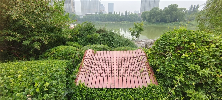 公园的中心湖东岸,还有一处碑廊,碑廊不算长,也就三四十米。廊壁上刻有唐代山西籍诗人诗作15首,一首首赏过,我不禁再次为山西籍诗人在中国古代文学史上的贡献而骄傲。
