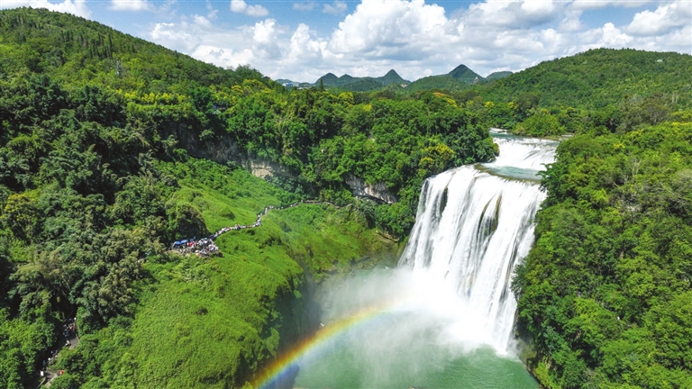 8月16日,游客在贵州省安顺市黄果树瀑布景区游览(无人机照片)。初秋时节,位于贵州省安顺市的黄果树瀑布景区进入一年中的最佳观赏期。大瀑布奔腾而下、气势磅礴,前来观赏游玩的游客络绎不绝。新华社发(袁福洪 摄)