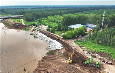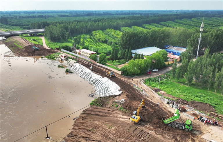 日前,中铁十二局集团天津工程项目部主动参与当地抗洪抢险,组织成立抗洪抢险救援队,调配大型机械及相关抢险救援物资,有力支援了滨海新区抗洪抢险。图为项目部在对大清河堤坝进行紧急加固。赵桂军 赵世凯 摄