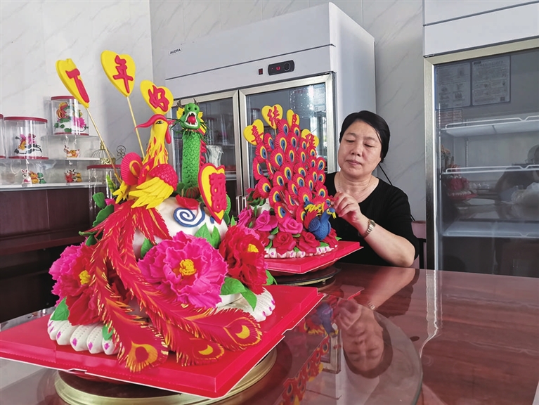 在工作台旁,王凤仙和同事刚刚完成花馍面塑作品《凤凰于飞》,寓意夫妻和好恩爱。牡丹、凤凰均是国画题材,王凤仙根据自己的理解,把国画内容用面塑的形式创作,4天时间,作品做出来了。
