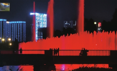 8月20日,夜幕下的长风商务区水声光影交相辉映,吸引市民前来消暑纳凉。牛利敏 摄