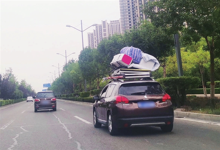 8月20日,滨河西路祥云桥附近,一辆小型越野车车顶驮着大堆杂物由北向南一路疾行。杂物有一米多高,由细绳捆绑在行李架上,一旦掉落很可能威胁后方车辆安全,看着十分危险。希望市民引以为戒,自觉遵守交通法规。郭晓华 摄