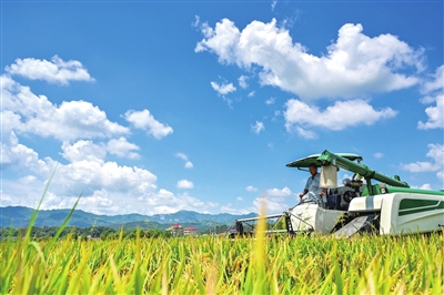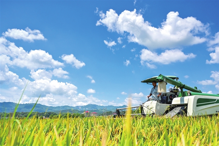 8月22日,在湖南省娄底市双峰县井字镇花桥村,农民驾驶收割机收割稻谷。
