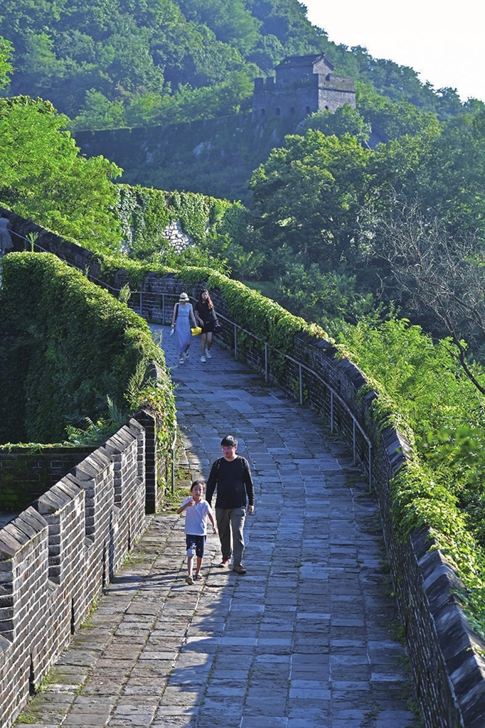 8月23日,游客在虎山长城上参观游览。虎山位于辽宁省丹东市鸭绿江畔,夏日,在植被映衬下,长城蜿蜒多姿,壮美秀丽,吸引游客前来参观游览。新华社记者 杨 青 摄