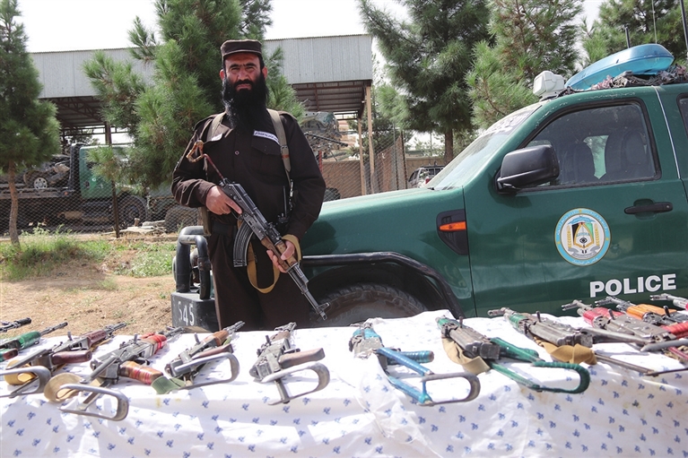 这是8月29日在阿富汗巴尔赫省拍摄的被阿富汗安全部队收缴的武器。新华社发