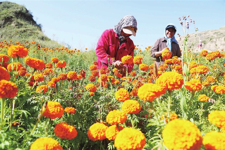 9月4日,农民在甘肃省定西市陇西县马河镇贺家川村采摘万寿菊。初秋时节,甘肃省定西市陇西县4万亩万寿菊进入采摘期,农民们趁着晴好天气采摘、装车、出售,田间地头一派忙碌景象。新华社发(王克贤 摄)