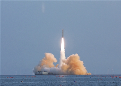 9月5日17时34分,我国太原卫星发射中心在山东海阳及附近海域使用谷神星一号海射型运载火箭,将天启星座21星-24星共4颗卫星顺利送入预定轨道,发射任务获得圆满成功。新华社发 (安 迪 摄)