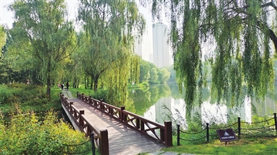 早晨的观景桥也是韵味十足。沿着观景桥徜徉于小林深处,林间的鸟鸣叩动晨曦和朝阳。微风拂过,细细碎碎的阳光洒落湖面,荡起层层粼波。鱼儿欢乐游过,它们相交、平行,又回旋欢跳着走远。观景台上的游人举起手机,按下快门,时光便跟着定格。手机里是景,他们也是景。