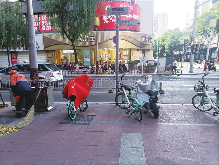 日前,在柳巷南路上,一家沿街店铺将湿漉漉的地垫晾晒到了一辆共享单车上。希望商家能自觉纠正这种不文明行为。李 涛 摄