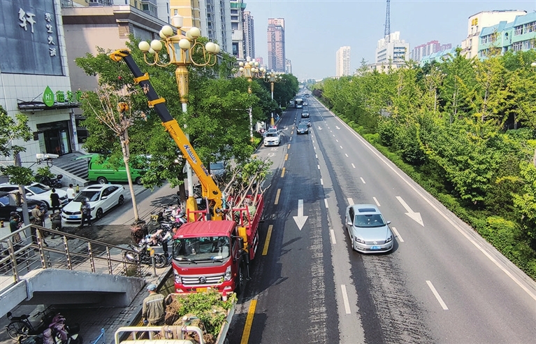 9月6日,园林工人正在漪汾街上更换行道树。市园林部门对城区各街道绿化带、绿地内退化、长势不良的苗木进行更换,消除黄土裸露,扎实推进创城整治行动。牛晨阳 摄