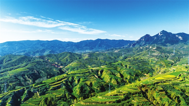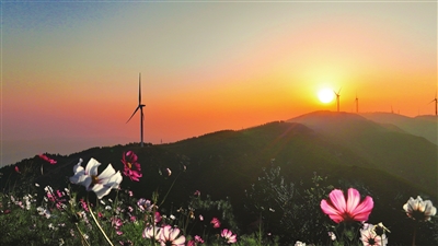 山顶,提子头风电场,转子叶片在晨曦中闪着光亮;“彩虹公路”边,盛放的波斯菊摇曳生香;山坡上,晨起的牛羊啃食青草;黛青的山峦间,满目葱茏,生机盎然……一幅古交市绿水青山拥抱金山银山的写真画卷。