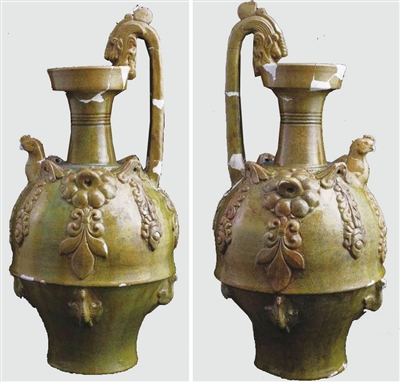 值得一提的是,青釉龙柄鸡首壶运用了多种精雕细刻的纹饰技法。在鸡首壶的表面堆雕了花瓣三角形圆孔系、莲瓣形钮、凤鸟、垂束莲和忍冬纹图案,划刻了颈部弦纹等,如此以多重堆塑装饰手段来完成的纹样装饰,十分生动地表达出了当时的人们对“群生虫豸皆有灵”这一观念的认同。南北朝时期佛教盛行,因此,象征着生命不息、解脱贫穷和疾病、趋吉辟邪、平安喜乐的佛教纹饰垂束莲、忍冬纹等图案就流行起来。