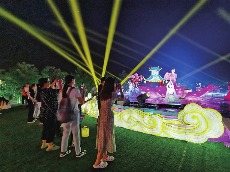 晚8时许,“十二花神”翩翩起舞,“花神祈福舞”如梦似幻,灯光交织,宛如仙境,惊艳众人。一舞终了,身着华服的“花神”步下舞台,与游客擦肩而过,散落于桃林各处,在属于自己的花灯前起舞。游客们拿起手机不住拍照,留下“花神”的倩影和时光交错的浪漫。不远处,古琴曲声悠扬,串串音符滑入温柔夜色。