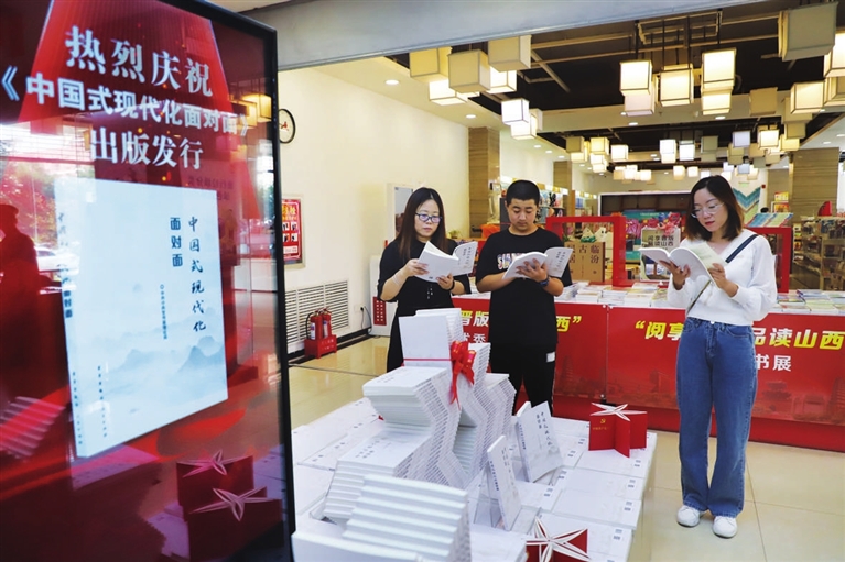 近日,中央宣传部理论局组织编写的《中国式现代化面对面》出版发行。9月16日,山西图书大厦《中国式现代化面对面》图书专柜前,读者驻足阅读。张昊宇 田 甜 摄