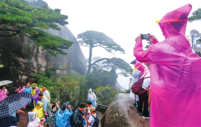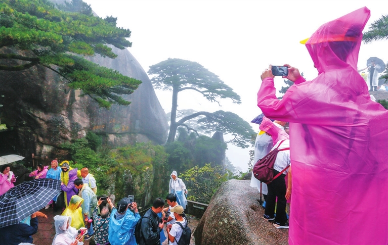 游客们在黄山风景区内游览(9月15日摄)。安徽省黄山市是我国著名旅游城市之一,该市以秀丽的风光以及传统徽派建筑和文化,吸引了大量游客。新华社发(施亚磊 摄)