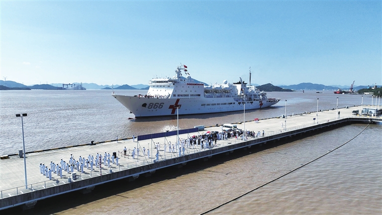 九月十九日,执行“和谐使命-二O二三”任务的海军“和平方舟”号医院船顺利返回浙江舟山母港。新华社发 (桂江波 摄)
