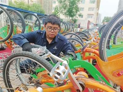 9月19日,太原公交集团公共自行车公司举行秋季保养活动。维修师傅们对每辆自行车加注润滑油,检查脚蹬等,确保市民骑行安全。
