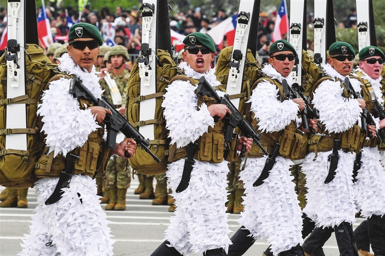 9月19日,在智利首都圣地亚哥,士兵在阅兵式上列队前进。当日,一年一度的智利陆军节阅兵式在首都圣地亚哥奥伊金斯公园举行。智利陆海空三军和警察部队7700多人参加了阅兵式。新华社发
