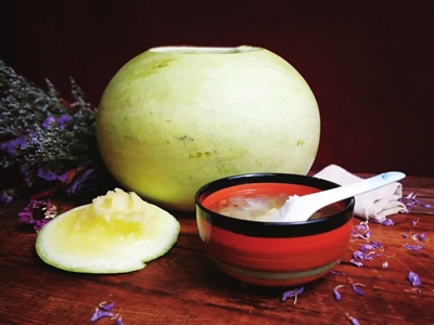 小时候舅姥爷善种瓜,老屋正房牌位桌下面常滚着一地硕大的三白瓜。皮青白,形如冬瓜,大到三四十斤都很正常,土名也叫枕头瓜。三白瓜翠衣厚实,可以放到第二年清明时节甚至更久。传统三白瓜除即食之外,大多都是贮存起来慢慢吃。晋西南人节俭惯了,但凡“能放”之物皆符合他们的生活习惯。小时候过年期间,村街上会有摊贩拿出积攒的三白瓜,用碗盛着三白瓜汤论碗卖。多是用一个草圈在桌上将瓜固定好,正上方旋出美观的斜角圆口给瓜开个“天窗”,那块瓜皮作盖还可以再盖上,一柄木勺伸进去,把已经“油漏”(土语,瓜久放而泻为汤汁之意)的瓜汤带籽刮盛出来。这大概就是万荣三白瓜最经典的吃法了。尤其在家里人多聚餐时,一碗碗瓜汤在亲人之间分享传递,特别有氛围感。