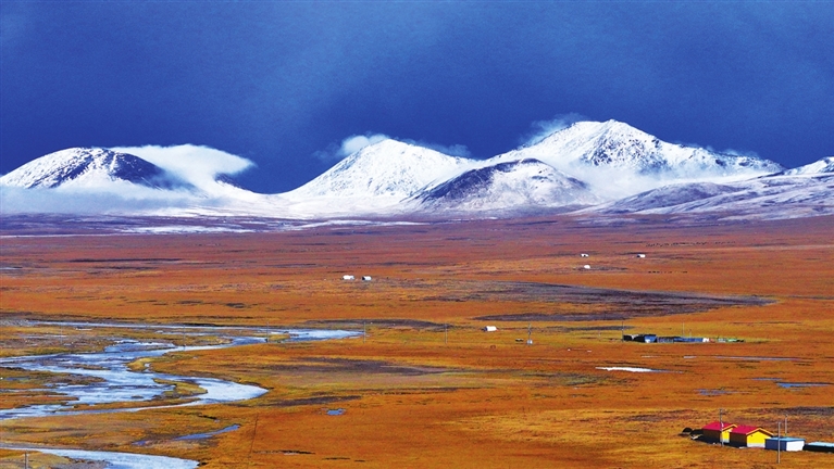 金秋时节,在位于三江源地区的青海省玉树藏族自治州境内,雪山、草原、云海、牛羊组成一幅壮美的秋日画卷。新华社记者 张宏祥 摄