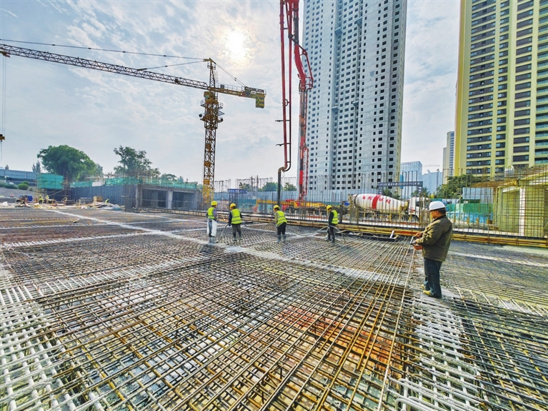 在工地西南角,正在进行雨水调蓄池顶板的浇筑作业。几名工人踩在横平竖直的钢筋架上,操作着混凝土输送管和振动筛。