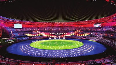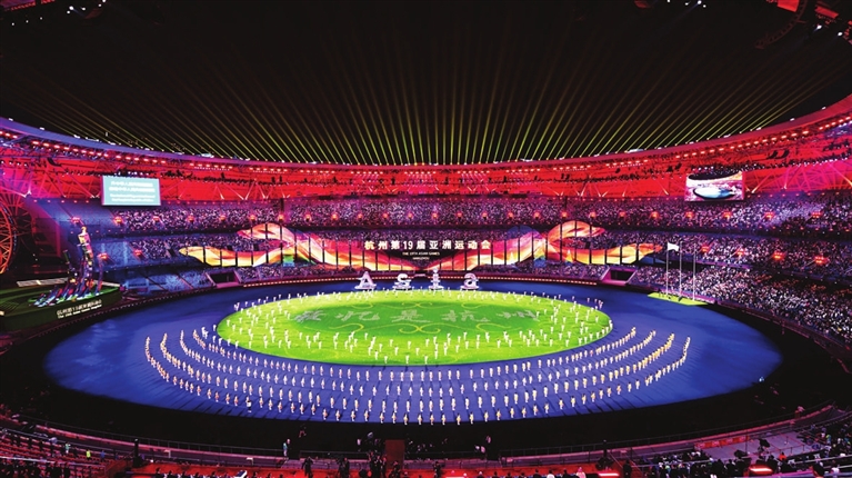 钱塘江畔,夜幕下的杭州奥体中心体育场流光溢彩,宛如一朵美丽的“大莲花”。场内欢声笑语、歌舞飞扬。来自亚洲各国各地区的运动员相聚于此,分享属于他们的体育文化盛宴。