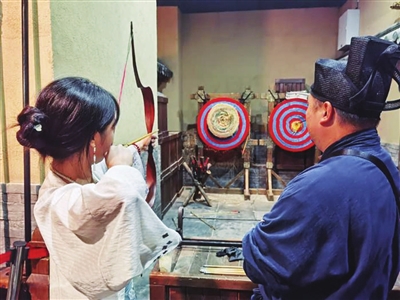 不少身穿汉服的游客或手持团扇身姿摇曳,或在“校场”体验弯弓射箭,或端着一碗臭豆腐大快朵颐。据统计,潭州市集假期接待游客12多万人次,日均客流量较节前周末增长50%以上,店铺销售额增长近七成。