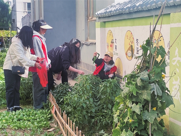 居民刘女士和社区工作人员一起采摘。她夸赞道,这个睦邻菜园是个宝,既能体验种植的辛苦,得到收获的快乐,还能吃到绿色新鲜的蔬菜,真是一举多得。