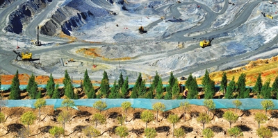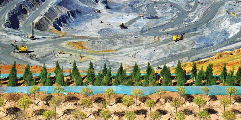 10月11日,中国宝武太钢集团尖山铁矿的园林人员正在采矿场周边植绿。该矿坚持美丽矿山改造建设,使昔日光秃秃的采矿场,逐渐变为一座景色秀美的植物园。王旭宏 摄