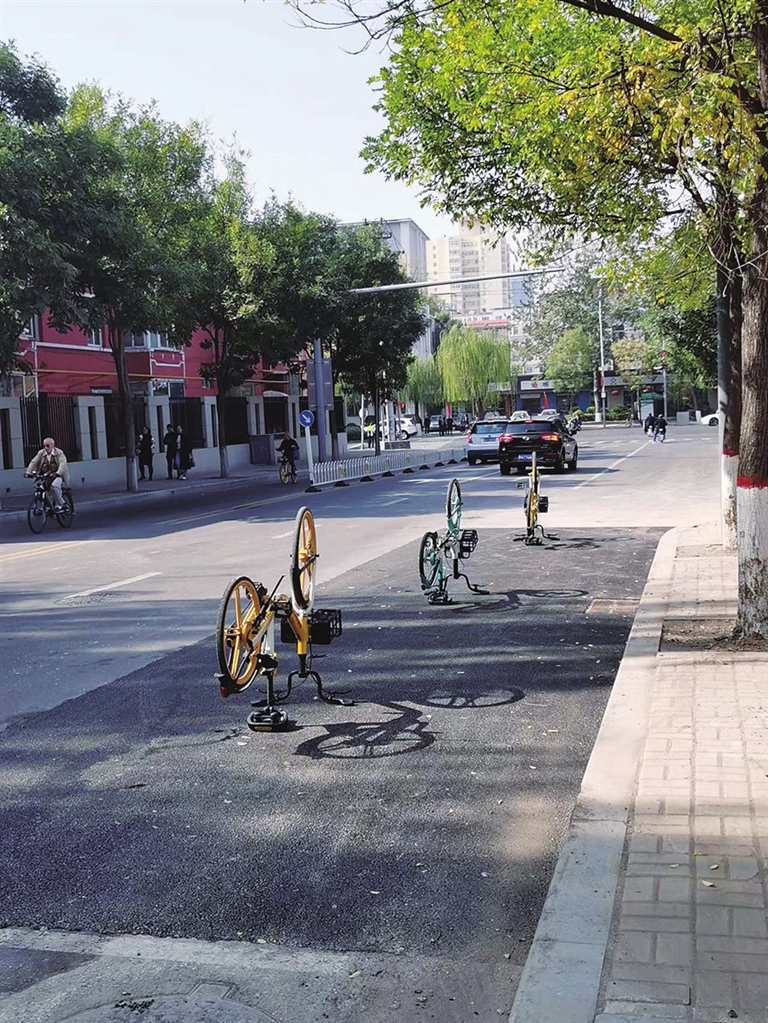 10月16日中午,在羊市街西口附近,三辆共享单车倒立在街头,路过的市民议论,可能是有人以此来占车位,也有可能是小孩儿恶作剧,但不论是什么原因,都不美观,影响市容形象。