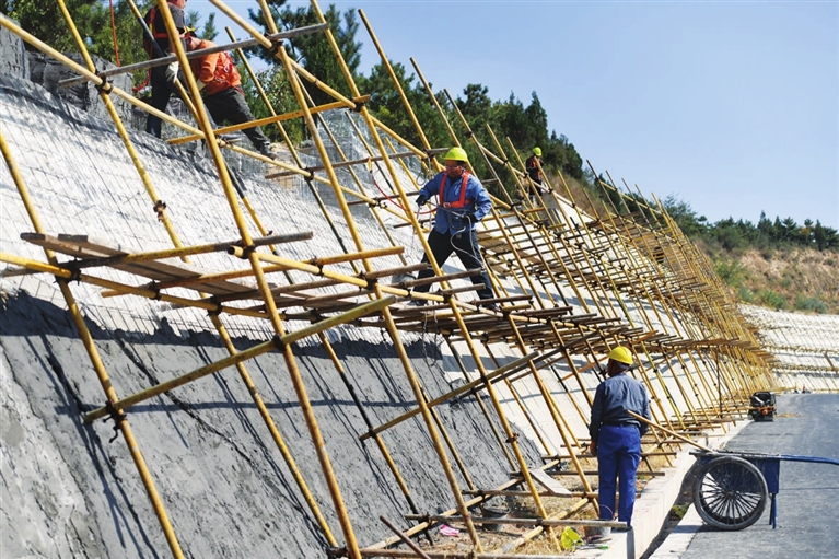 10月16日,杏花岭区中涧河镇东山旅游公路西岭村段,施工人员在建设墙体浮雕。该浮雕全长200余米,以晋商文化为主题,将使游客在体验生态美景的同时,感受晋商文化魅力。牛利敏 摄