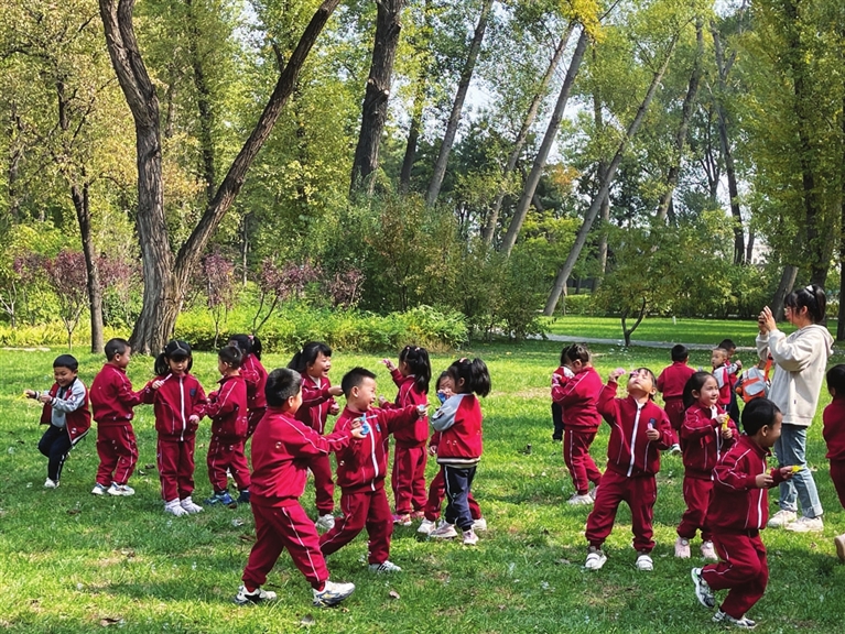 沿着整洁的道路,孩子们快乐地歌唱,手拉手走进公园。社区工作人员和老师们沿途引导幼儿观察、体验秋天的变化,并给孩子们讲述了许多关于植物生长的知识。孩子们边听边看,叽叽喳喳地讨论,用纯真的双眼认识秋天、感受秋天。
