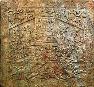 这一切,还要从1999年太原市王郭村发现的一座汉白玉石椁说起。石椁由椁座、椁壁、椁顶三部分组成。顶部采用的是中国传统的歇山式结构,椁壁内外是彩绘和局部描金的浮雕装饰,椁座下方由八个石狮头垫于底部。整座石椁精美绝伦。令人惊讶的是,浮雕上的人物个个高鼻深目,内容为人狮、象狮搏斗图,庆祝葡萄丰收图,胡腾宴舞图等,反映的都是中西亚一带的风土人情。最为特别的是,位于石椁底座正中位置,两个人首鹰身的祭司,相对而立,小心翼翼地抬着火坛。这是古代波斯祆教中祭拜火神的场景。石椁在外形上采用了中国传统的建筑结构,浮雕图案又表现了墓主人母国的风土人情和宗教信仰。