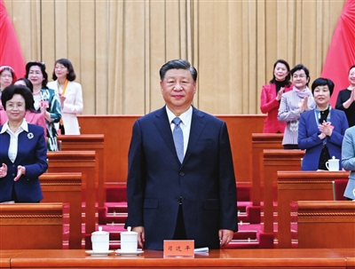 10月23日,中国妇女第十三次全国代表大会在北京人民大会堂开幕。这是中共中央总书记、国家主席、中央军委主席习近平在主席台向与会代表致意。新华社记者 谢环驰 摄