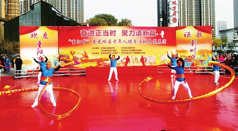 主会场的展演活动在《爱我中华》的歌声中拉开帷幕,老年人献上《骏马健步操》《红旗颂》《中国范》《人说山西好风光》等健身舞蹈表演,展现“最喜夕阳无限好,人生难得老来忙”的精气神,讴歌对党和祖国的深情热爱。空竹展演《空竹舞起来》、柔力球展演《桃花红杏花白》、木兰双扇表演《十送红军》,精彩节目轮番上演,赢得了观众的喝彩。