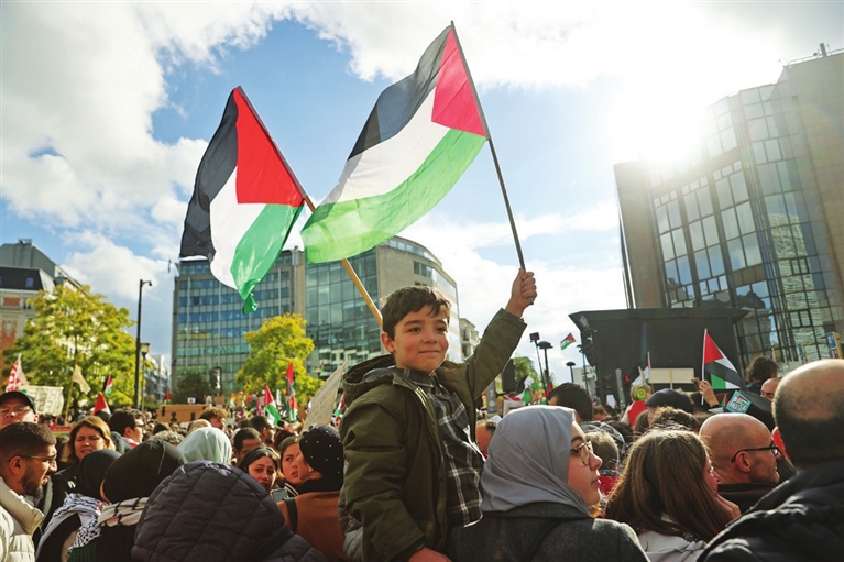 当日,众多巴勒斯坦支持者在位于比利时布鲁塞尔的欧盟总部附近举行集会,声援巴勒斯坦。