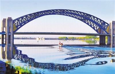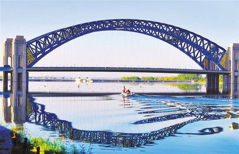 ①护河员在太原晋阳桥下水面上巡查。晋阳桥是太原市横跨汾河的第19座大桥,融合了古典与现代之美。