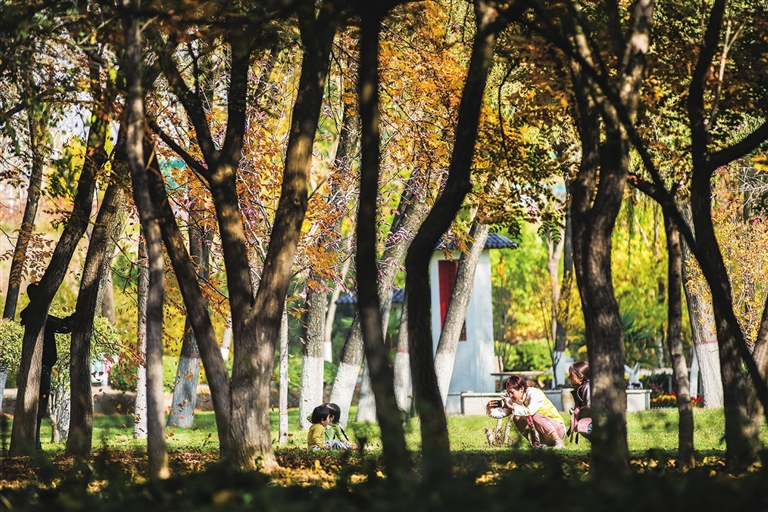 10月31日,南寨公园树影与黄叶交织,为市民呈现出一幅绚丽多彩的秋日画卷。王韵菲 摄