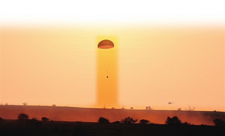 众人纷纷抬头仰望,只见一个红色的降落伞正从高空缓慢下降。“快看,是返回舱!”挂着神舟十六号载人飞船返回舱的降落伞越降越低,人们看得也越来越清晰。湛蓝的天幕下,红白相间的巨大降落伞在初升红日的照耀下分外鲜明,大家纷纷掏出手机、相机记录下这难得的瞬间。