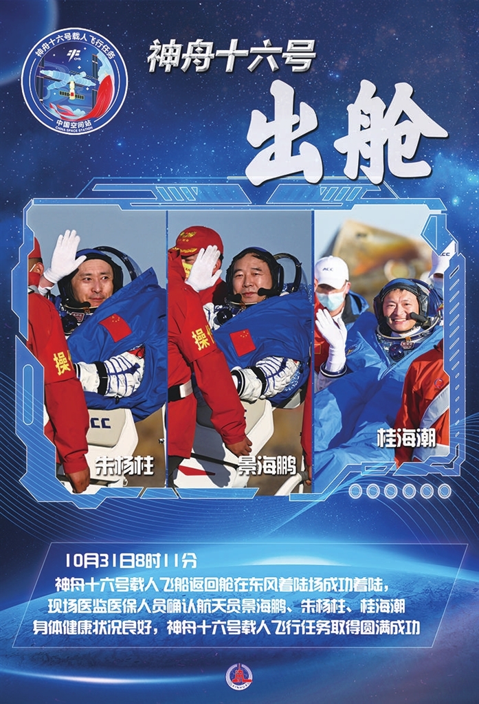 10月31日9时10分,神舟十六号航天员景海鹏、朱杨柱、桂海潮全部安全顺利出舱,健康状态良好。