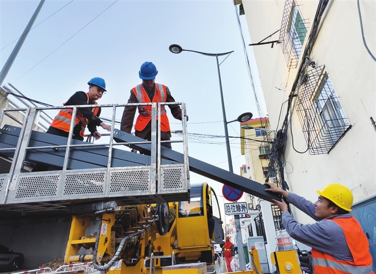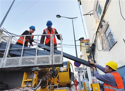 10月31日,施工人员在对五龙口海鲜市场跨线桥进行线缆整治。牛利敏 杨 斌 摄
