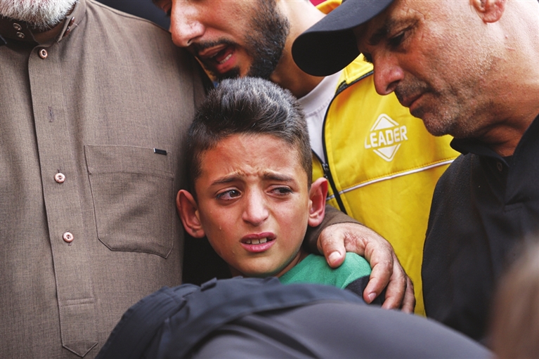 11月12日,一名男孩在加沙地带南部城市汗尤尼斯悼念逝者。