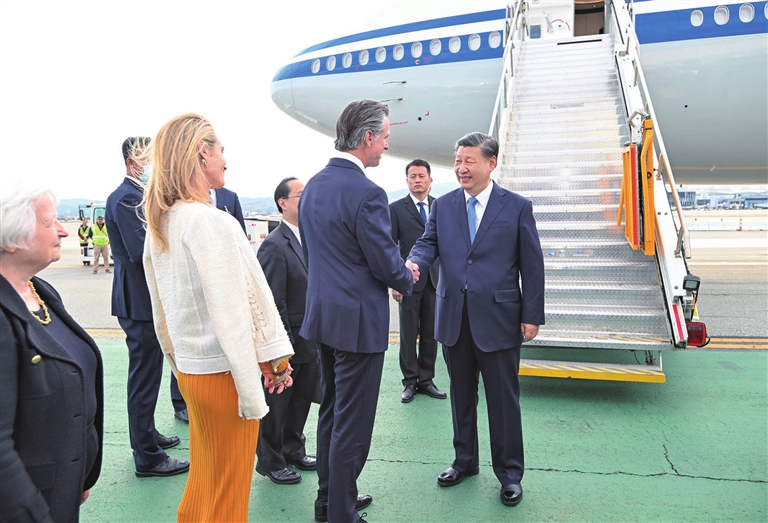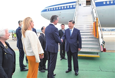 习近平乘坐专机抵达旧金山国际机场时,受到美国加利福尼亚州州长纽森、财政部长耶伦等美方代表热情迎接。